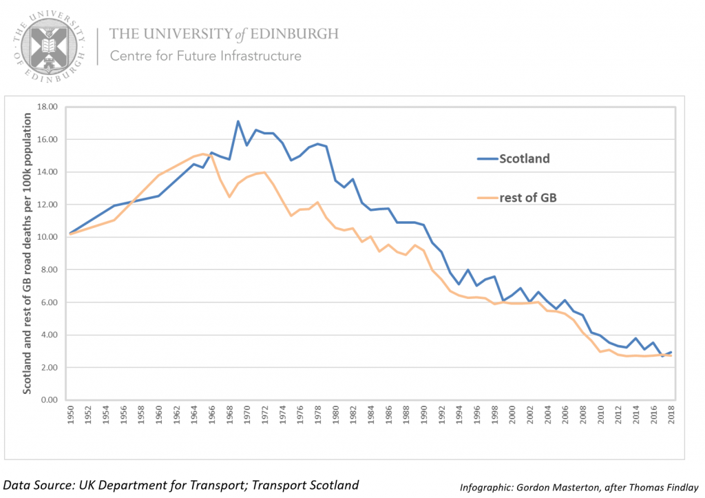 Fig 1 plots road death rates per 100,000 population for both Scotland and the rest of Great Britain since 1950.