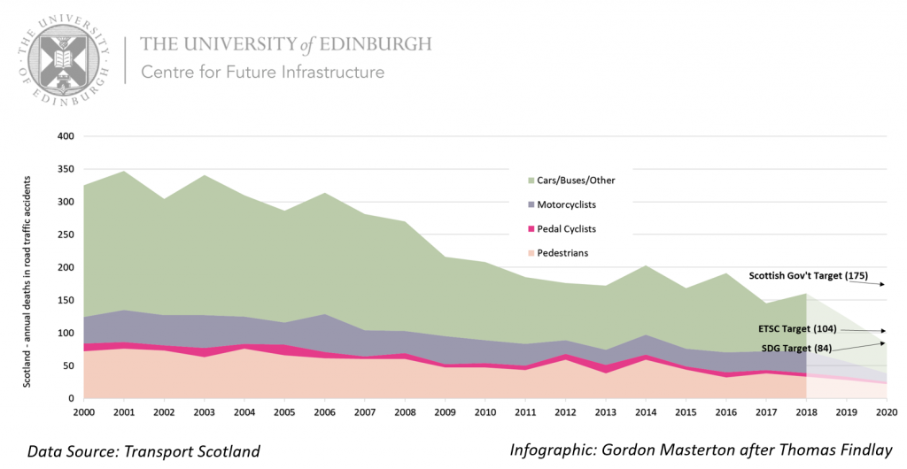 In 2018 there were160 fatalities on Scottish roads, the second lowest ever and still significantly less than the Scottish Government’s target set in 2009 (to reduce deaths in 2020 by 40% from the 2004-08 average [4]).