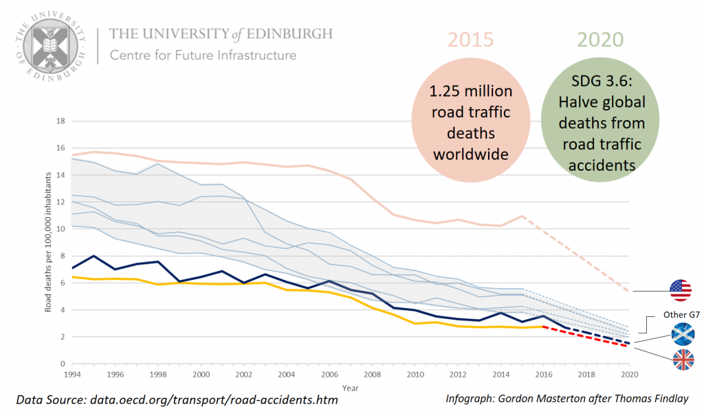 Reducing road accident deaths is one of the UN’s early Sustainable Development Goals, with a target date of 2020. The G7 Countries are already trending to miss the target. Professor Gordon Masterton asks whether Scotland could do better?
